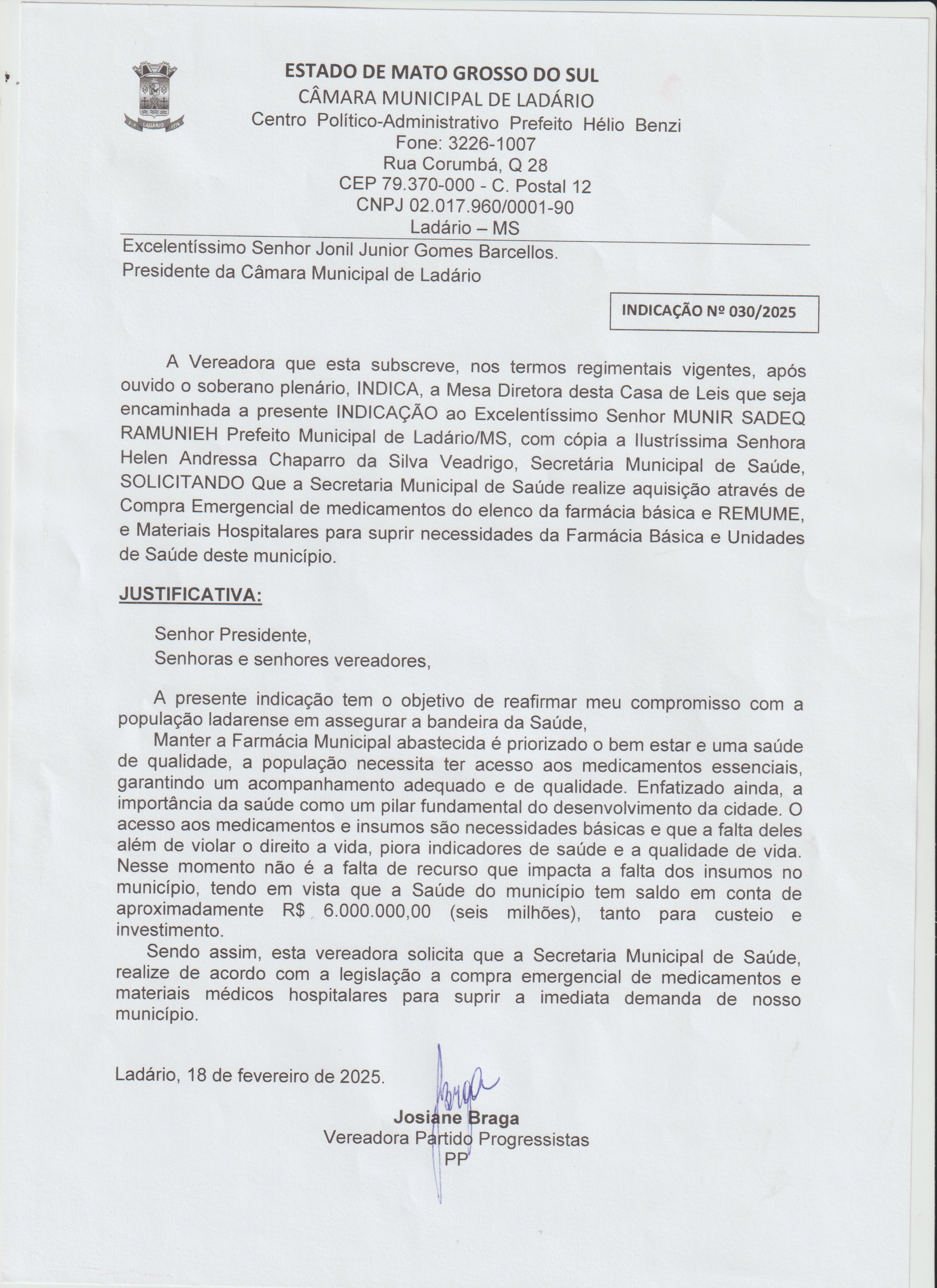 INDICAÇÃO N°30-2025 solicitando que a secretaria de saúde realize aquisição através de compra emergencial de medicamentos e remune e materias hospitalares para suprir necessidades da farmácia básica e unidades de saúde deste município. |