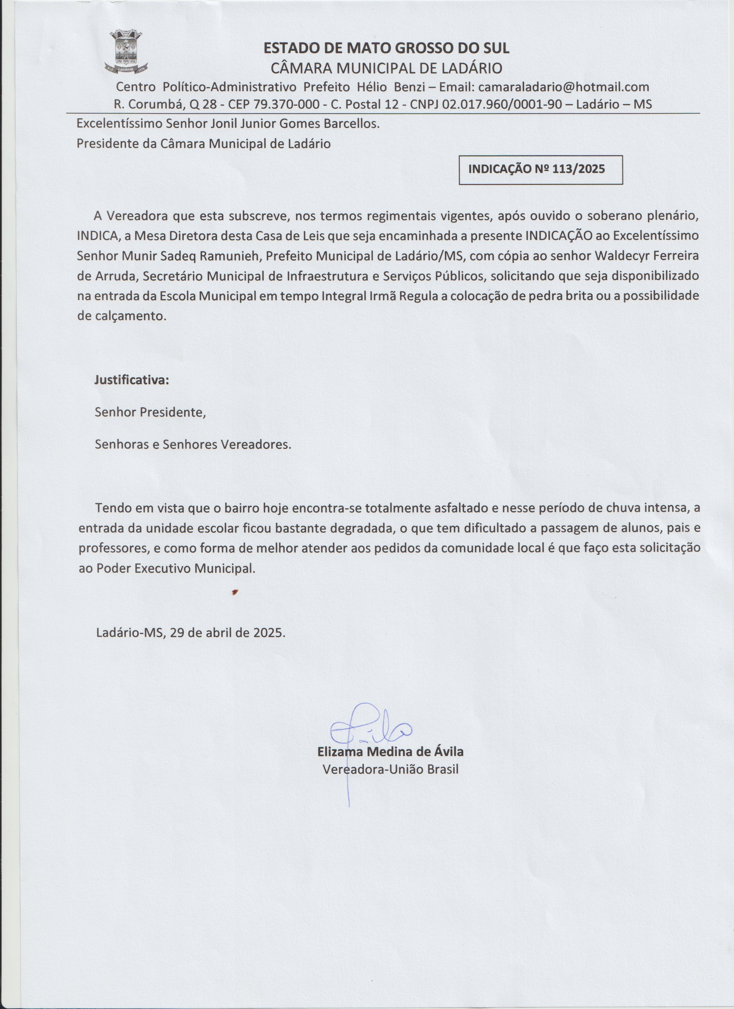 INDICAÇÃO N°113 2025 A VEREADORA ELIZAMA MEDINA DE ÁVILA SOLICITA QUE SEJJJA DISPONIBILIZADO NA ENTRADA DAS ESCOLAS MUNICIPAL EM TEMPO INTEGRAL IRMÃ REGULA A COLOCAÇÃO DE PEDRA BRITA OU A POSSIBILIDADE DE CALÇAMENTO. |