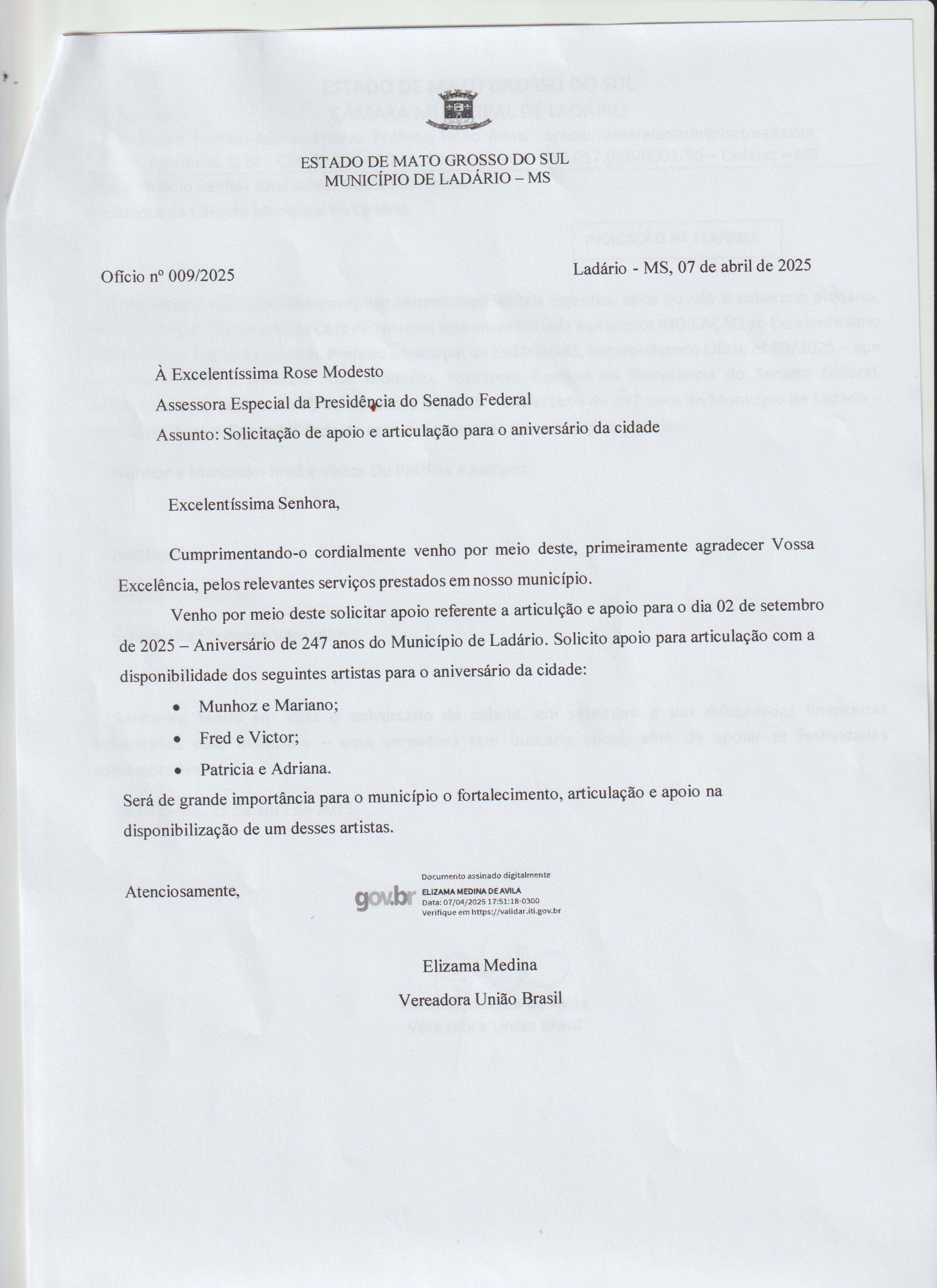 INDICAÇÃO N°114 A VEREADORA ELIZAMA MEDINA DE ÁVILA SOLICITA APOIO PARA O DIA 02 DE SETEMBRO DE 2025 ARTICULAÇÃO PARA DIPONIBILIDADE DE UMA DAS SEGUINTES APRESENTAÇÕES ARTÍSTICAS MUNHOS E MARIANO FRED E VICTOR OU PATRÍCIA E ADRIANA. |