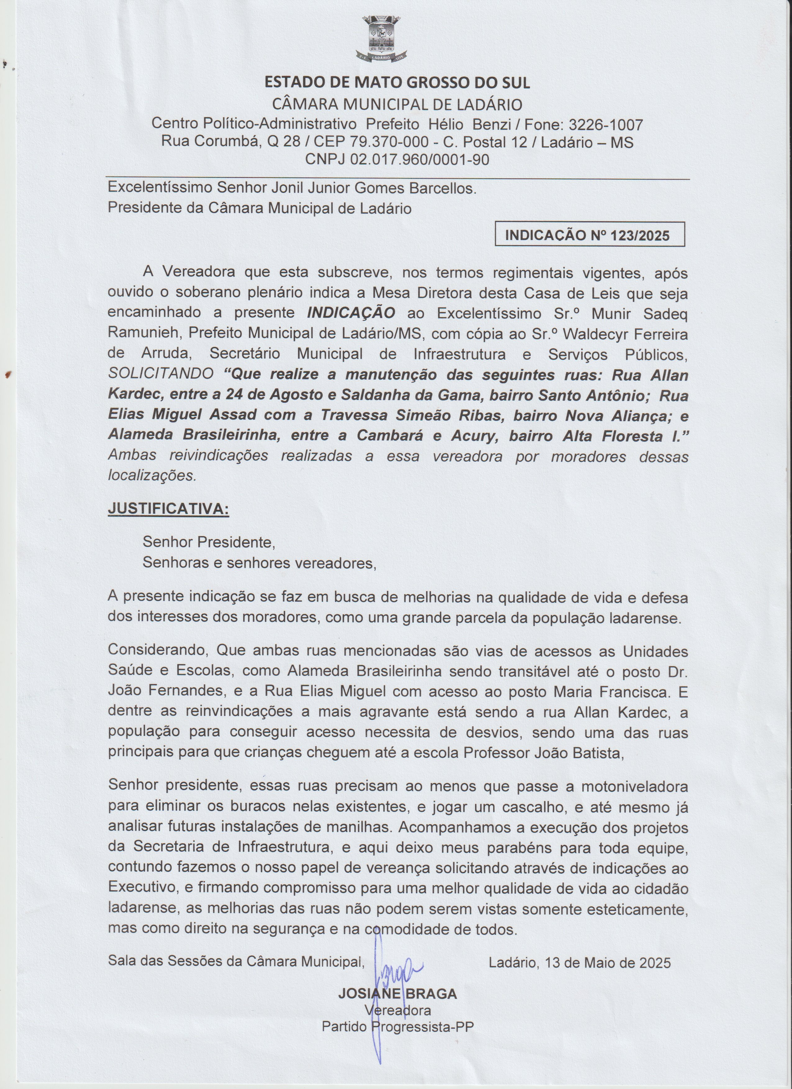 INDICAÇÃO N°123 2025 A VEREADORA JOSIANE BRAGA SOLICITA QUE REALIZE A MANUNTENÇÃO DAS SEGUINT5ES RUAS ALLAN KADEC BAIRRO SANTO ANTÔNIO RUA ELIAS MIGUEL ASSAD BAIRRO NOVA ALIANÇA RUA AL BRASILEIRINHA BAIRRO ALTA FLORESTA I |