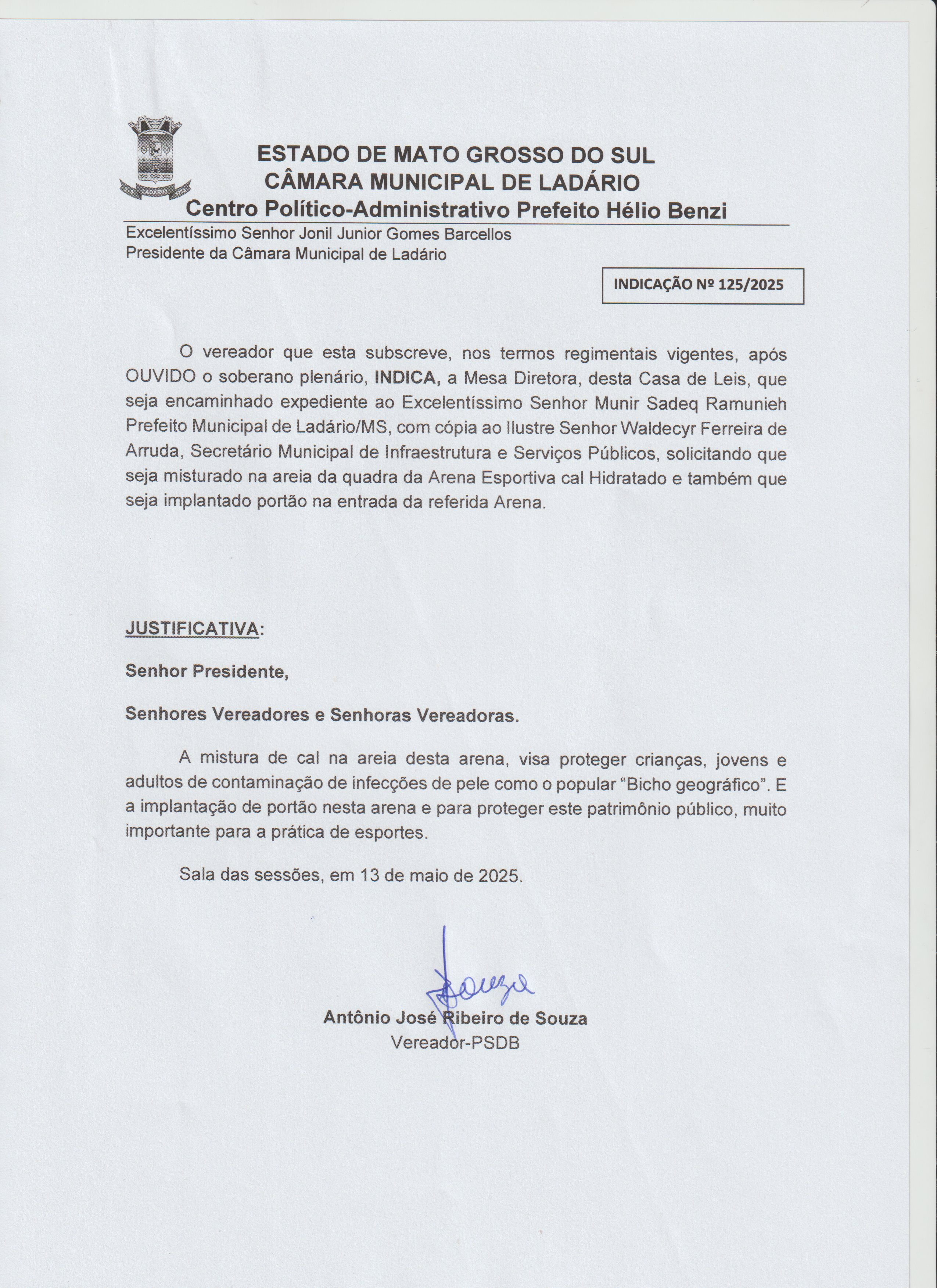 INDICAÇÃO N°125 2025O VEREADOR ANTÔNIO JOSÉ SOLICITA QUE SEJA MISTURADO NA AREIA DA QUADRA DA ARENA ESPORTIVA CAL HIDRATADO E TBM QUE SEJAM IMPLANTADOS PORTÃO NA ENTRADA DA REFEREIDA ARENA. |