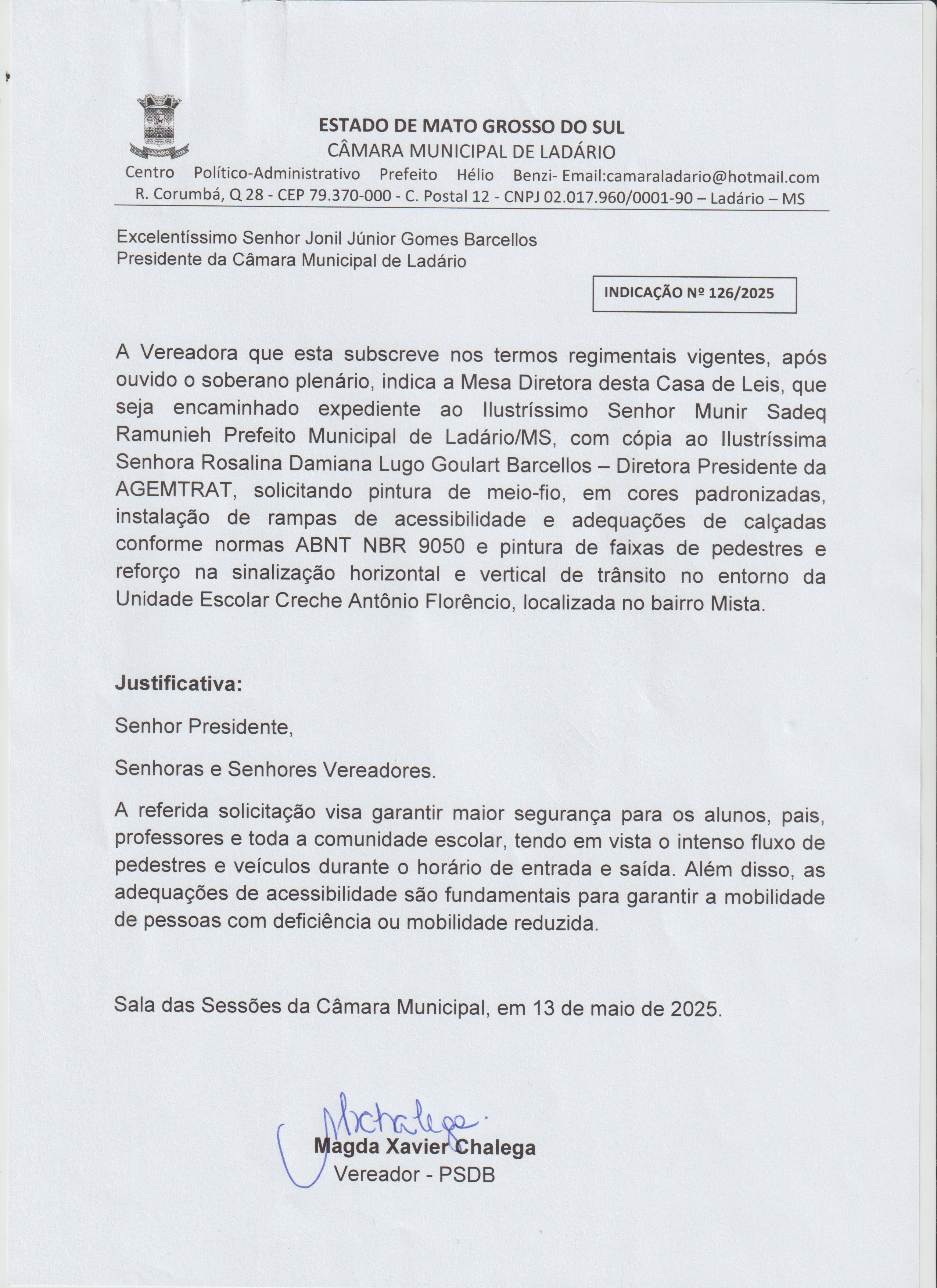 INDICAÇÃO 126 2025 A VEREADORA MAGDA CHALEGA SOLICITA PINTURA DE MEIO FIO EM CORES PADRONIZADAS INSTALAÇÃO DE RAMPAS DE ACESSIBILIDADE E ADEQUAÇÃO DE CALÇADAS CONFORME NORMAS ABNT NBR 9050 E PINTURA DE FFAIXAS DE PEDESTRES E REFORÇO NAS SINALIZAÇÕES HORIZONNTAL E VERTICAL DE TRÂNSITO NO ENNTORNO DA UNIDADE ESCOLAR CRECHE ANTÔNIO FLLORÊNCIO LOCALIZADO NNO BAIRRO MISTA. |