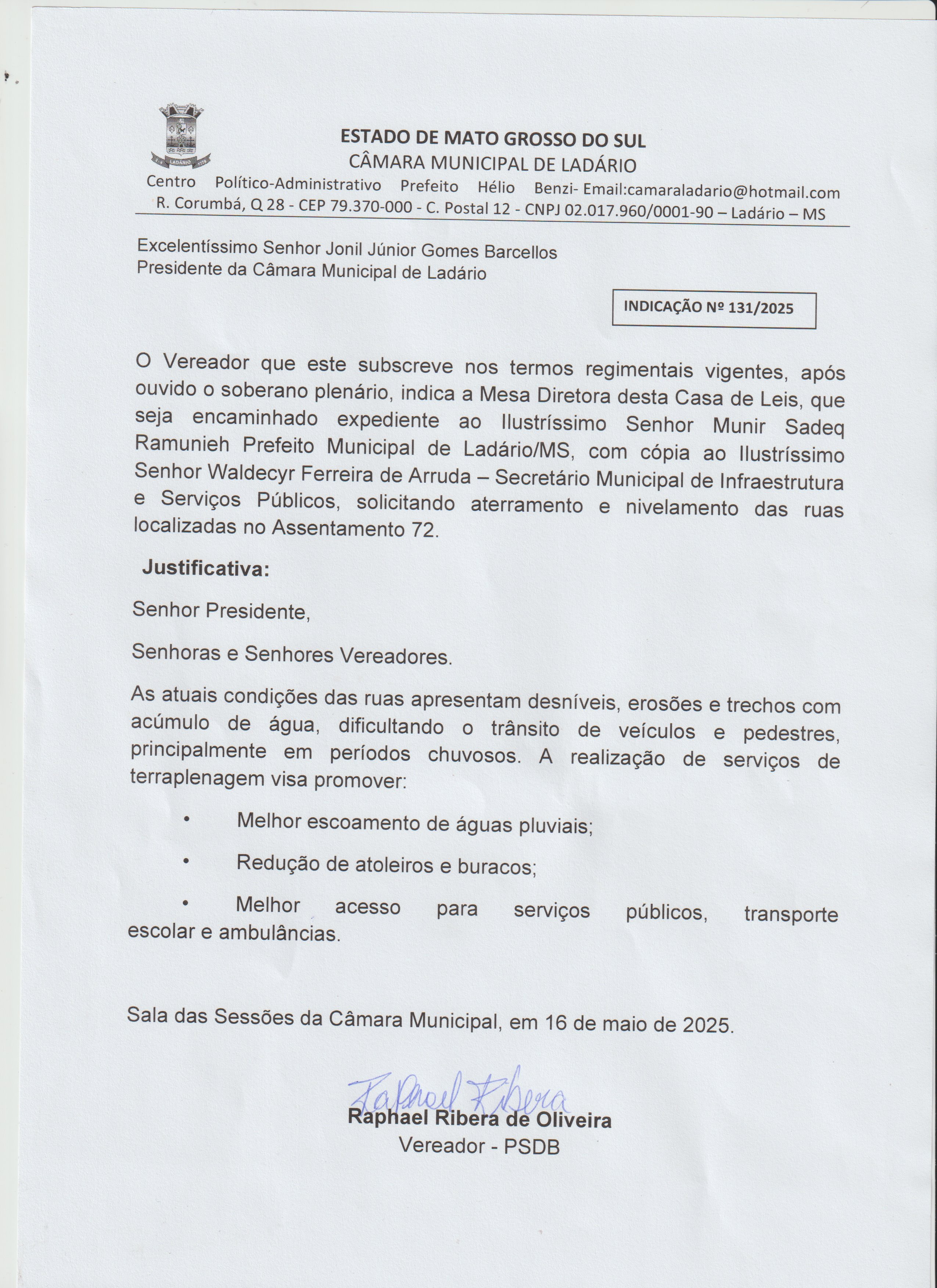 INDICAÇÃO N°131 O VEREADOR RAPHAEL RIBERA DE OLIVEIRA SOLICITA ATERRAMENTO E NIVELAMENTO DAS RUAS LOCALIZADAS NO ASSENTAMENTO 72. |