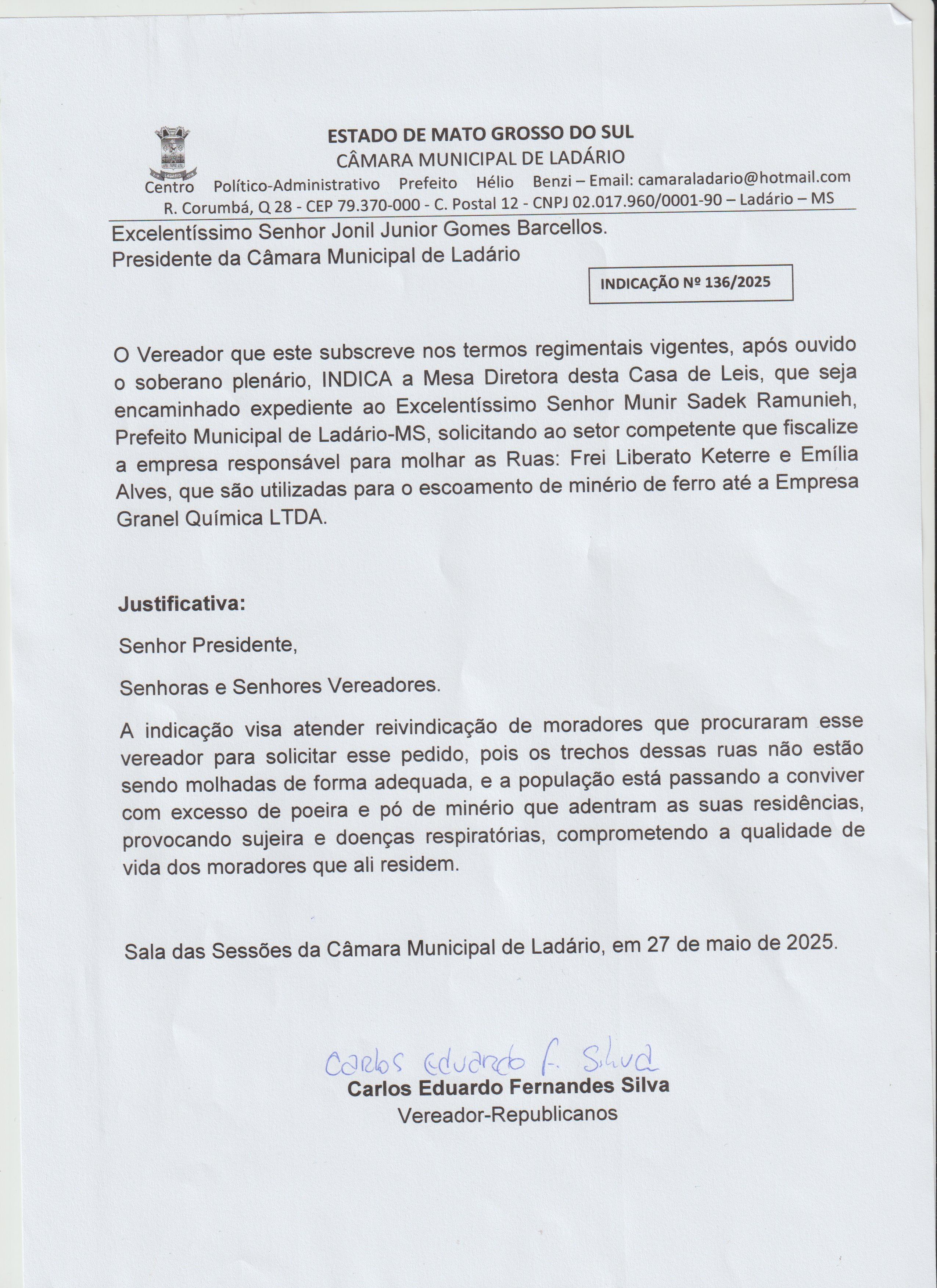 INDICAÇÃO 136 O VEREADOR CARLOS EDUARDO FERNANDEZ SILVA SOLICITA QUE MOLHEM A RUAS FREI LIBERATO KETERRE E EMÍLIA ALVES QUE SÃO ULTILIZADAS PARA O ESCOAMENTO DE MINÉRIO DE FERRO ATÉ A EMPRESA GRANEL QUÍMICA. |