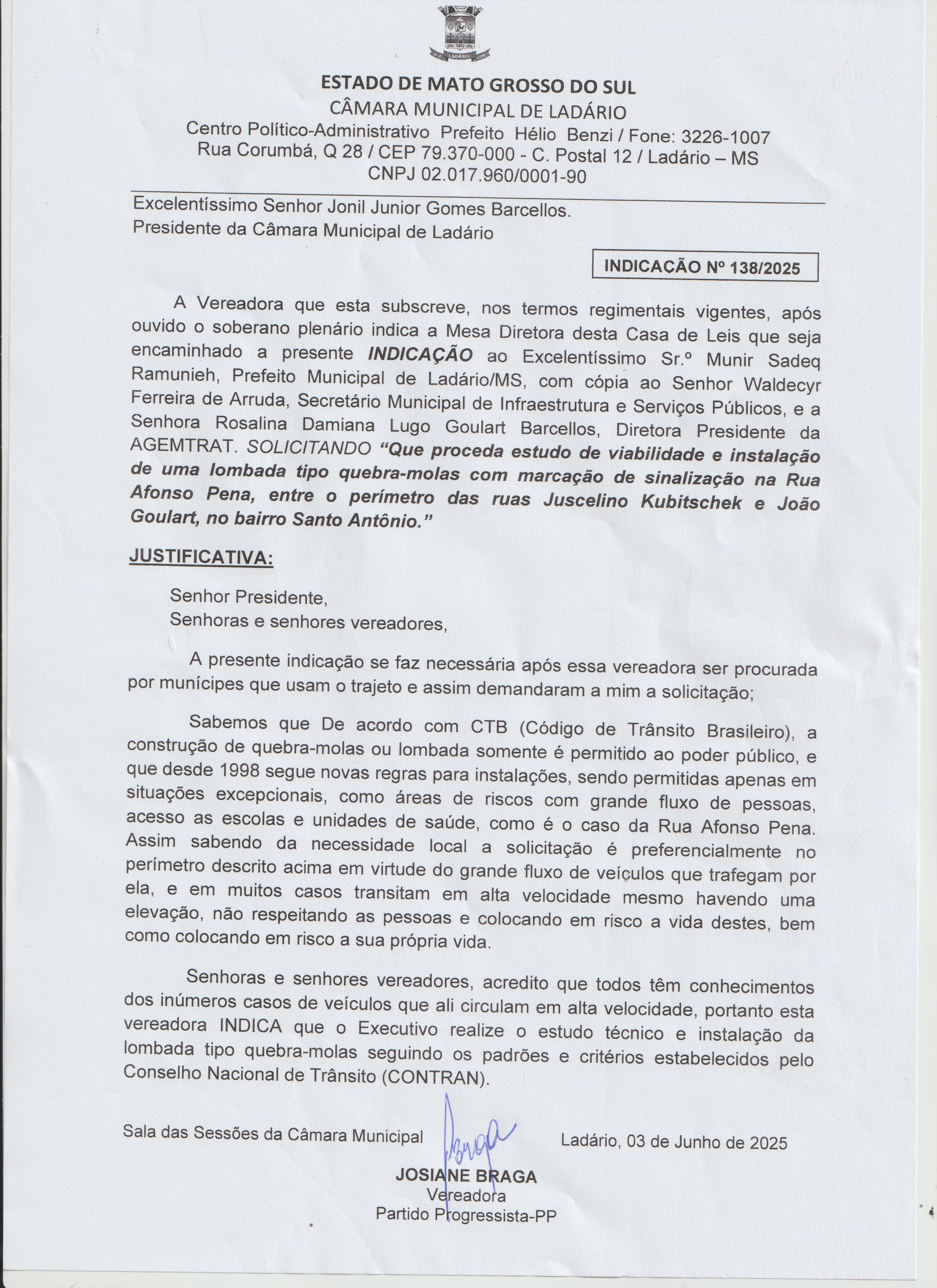 INDICAÇÃO N°138 A VEREADORA JOSIANE BRAGA SOLICITA QUE PROCEDA ESTUDO DE VIABILIDADE E INSTALAÇÃODE UMA LOMBADA TIPO QUEBRA MOLAS COM MARCAÇÃO DE SINALIZAÇÃO NA RUA AFONSO PENA ENTRE O PERÍMETRO DAS RUAS JUSCELINO KUBITSCHEK E JOÃO GOULART NO BAIRRO SANTO ANTÔNIO. |
