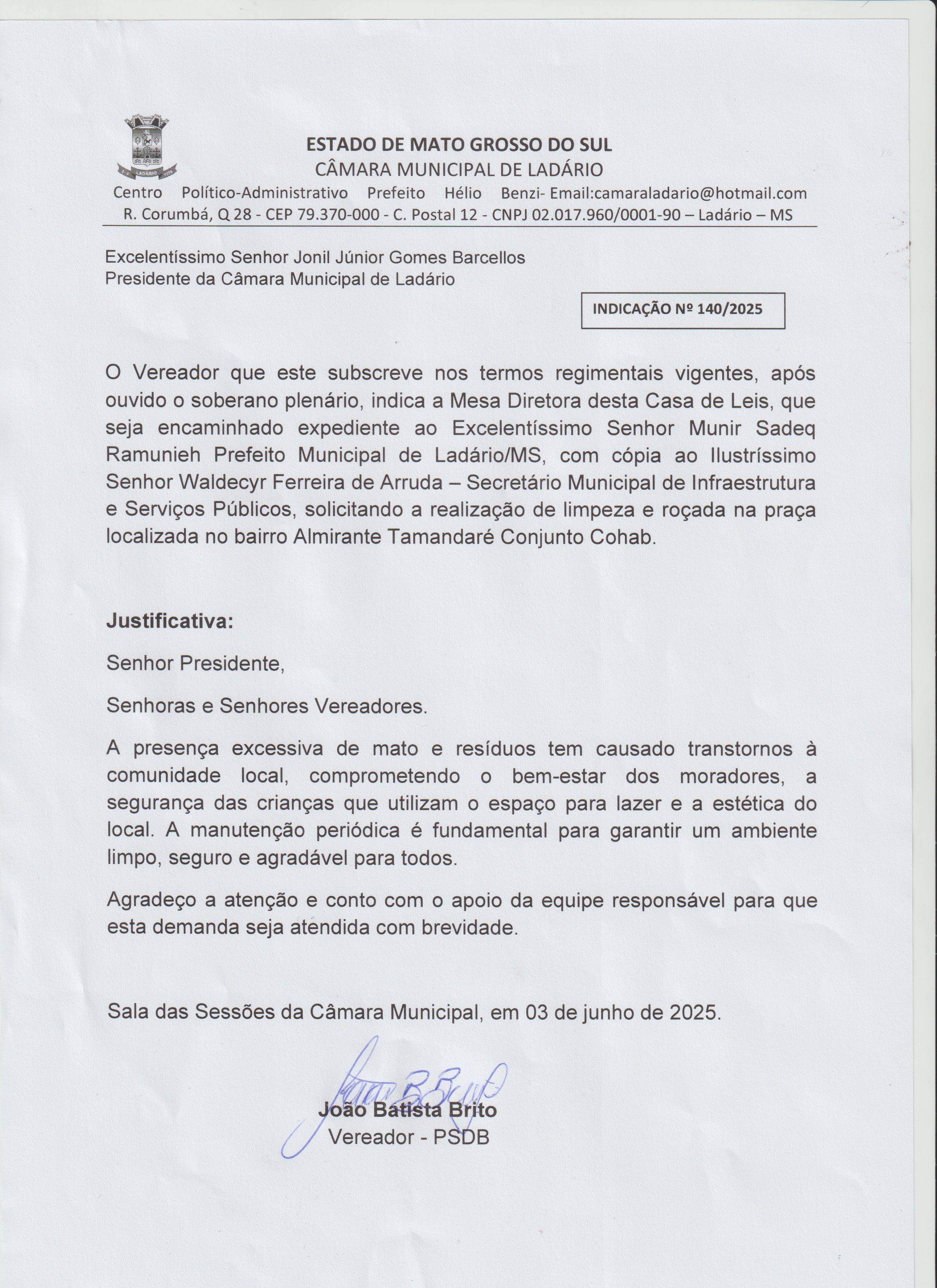 INDICAÇÃO N°140 O VEREADOR JOÃO BATISTA BRITO SLICITA SERVIÇOS PÚBLICOS REALIZAÇÕES DE LIMPEZA E ROÇADA NA PRAÇA LOCALIZADA NO BAIRRO ALMIRANTE TAMANDARÉCONJUNTO COHAB. |
