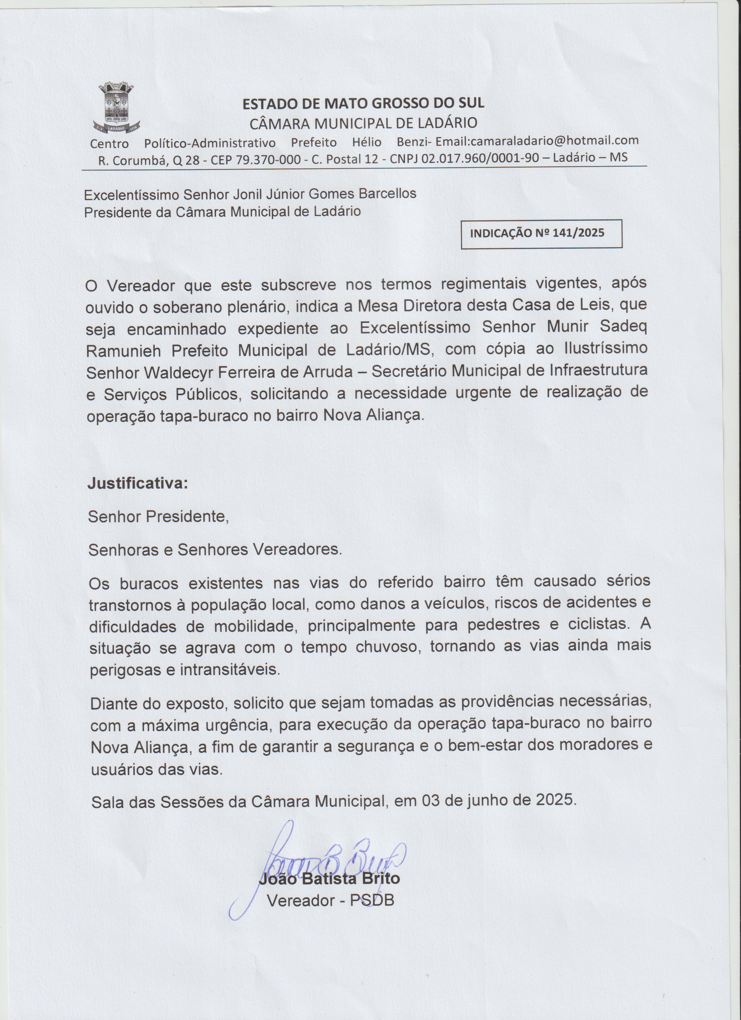 INDICAÇÃO N°141 O VEREADOR JOÃO BATISTA BRITO SOLICITA A NECESSIDADE URGENTE DE REALIZAÇÕES DE OPERAÇÕES TAPA BURACO NO BAIRRO NOVA ALIANÇA. |
