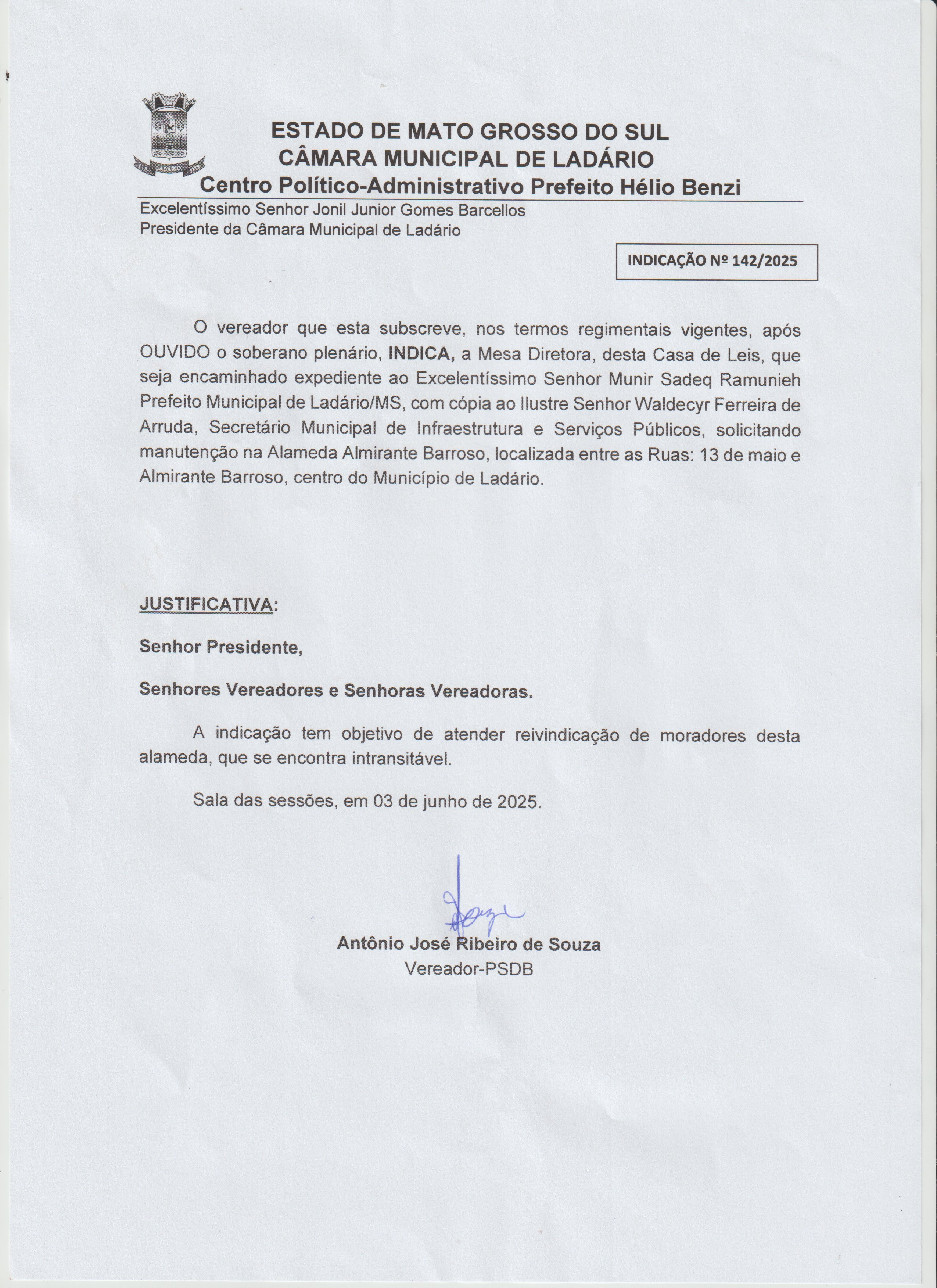 INDICAÇÃO N°142 O VEREADOR ANTÔNIO RIBEIRO DE SOUZA SOLICITA MANUNTENÇÃO NA ALAMEDA ALMIRANTE BARROSO CENTRO MUNICÍPIO DE LADÁRIO. |