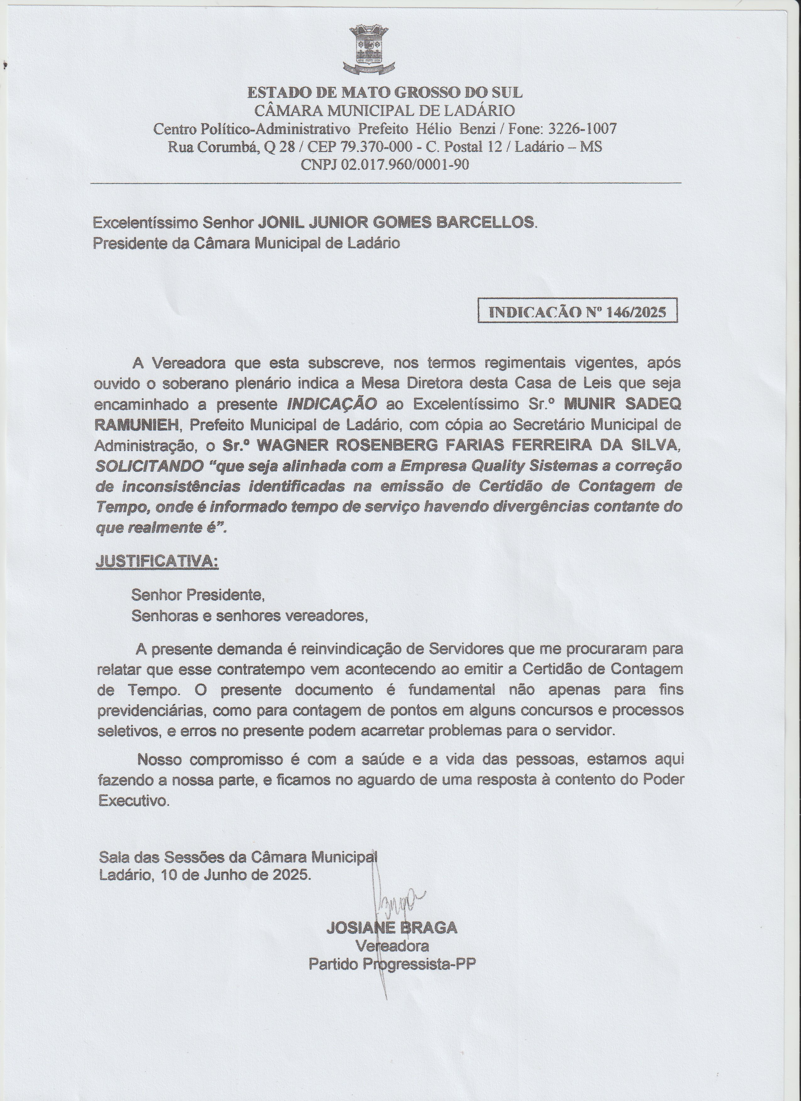 INDICAÇÃO N°146 A VEREADORA JOSIANE BRAGA SOLICITA QUE SEJA ALINHADA COM A EMPRESA QUALITY SISTEMAS A CORREÇÃO DE INCONSISTÊNCIAS INDENTIFICADAS NA EMISSÃO DE CERTIDÃO DE CONTAGEM DE TEMPO ONDE ÉINFORMADO TEMPO DE SERVIÇO HAVENDO DIVERGÊNCIAS CONSTANTE DO QUE REALMENTE É. |