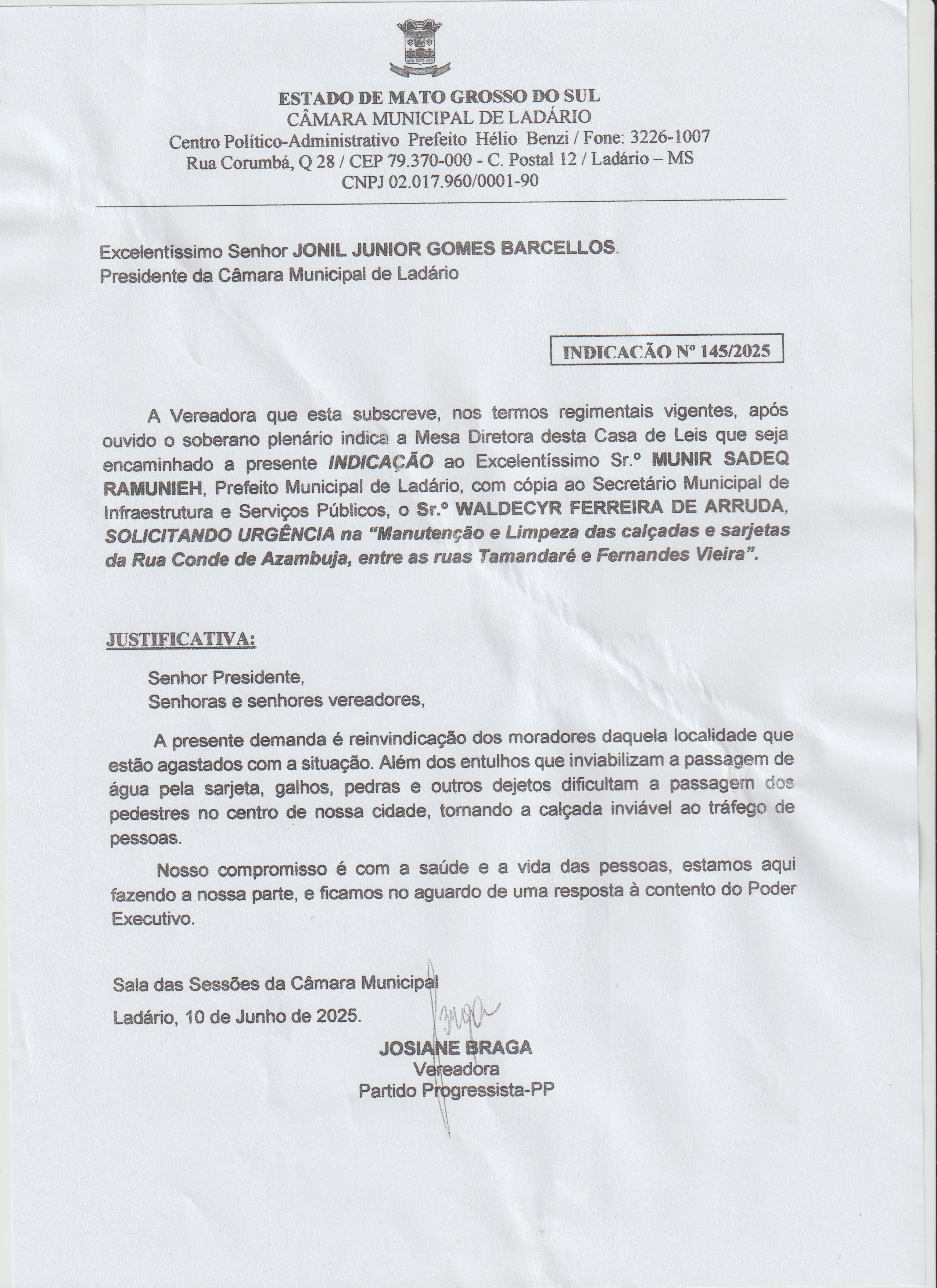 INDICAÇÃO Nº 145 A VEREADORA JOSIANE BRAGA SOLICITA URGÊNCIA NA MANUNTENÇÃO E LIMPEZA DAS CALÇADAS E SARJETAS DA RUA CONDE DE AZAMBUJA ENTRE AS RUAS TAMANDARÉ E FRENANDES VIEIRA. |