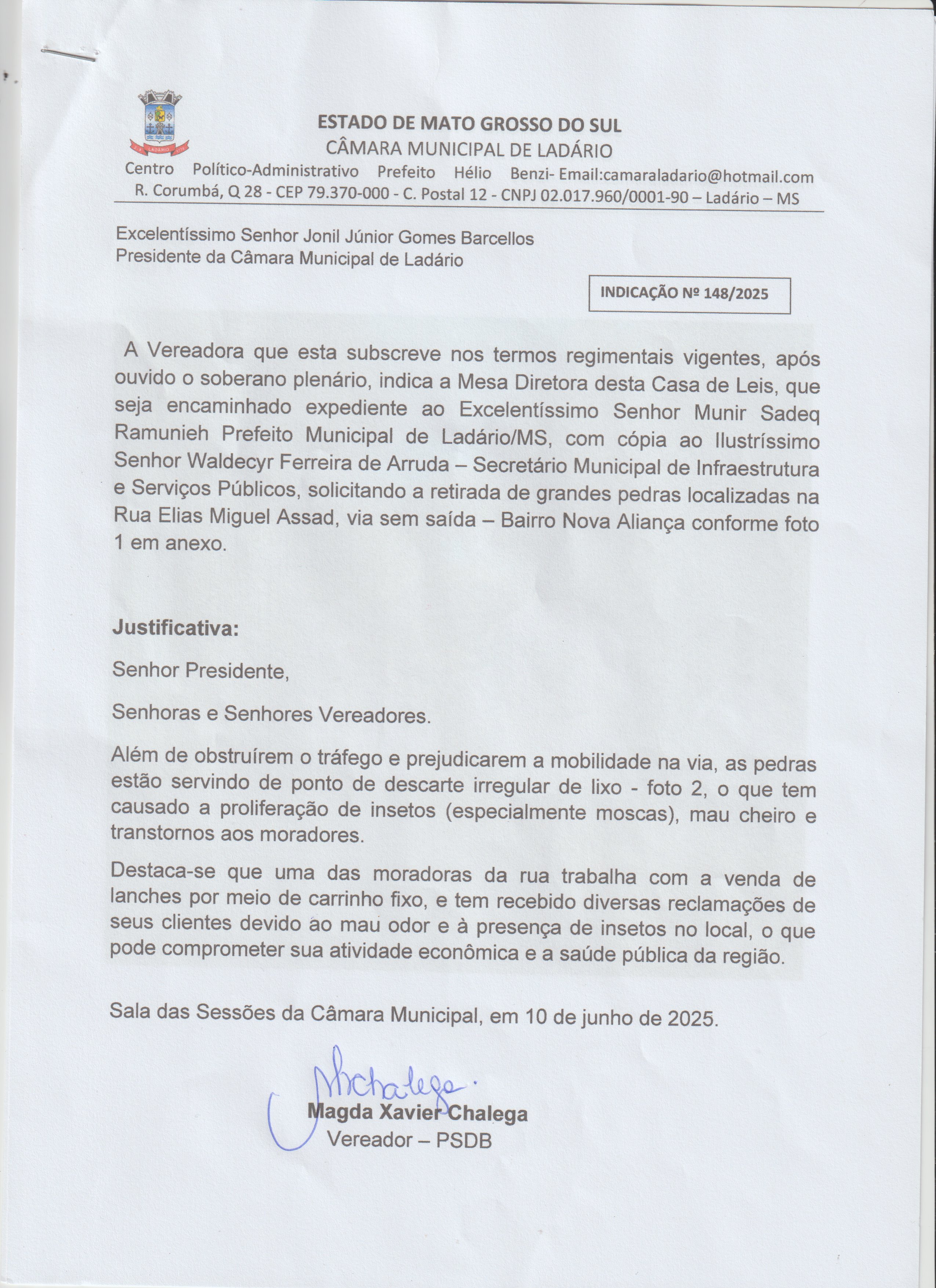 INDICAÇÃO N° 148 A VEREADORA MAGDA XAVIER CHALEGA SOLICITA A RETIRADA DE GRANDES PEDRAS LOCALIZADAS NA RUA ELLIAS MIGUEL ASSAD VIA SEM SAÍDA BAIRRO NOVA ALIANÇA CONFORME FOTO E 1 EM ANEXO |