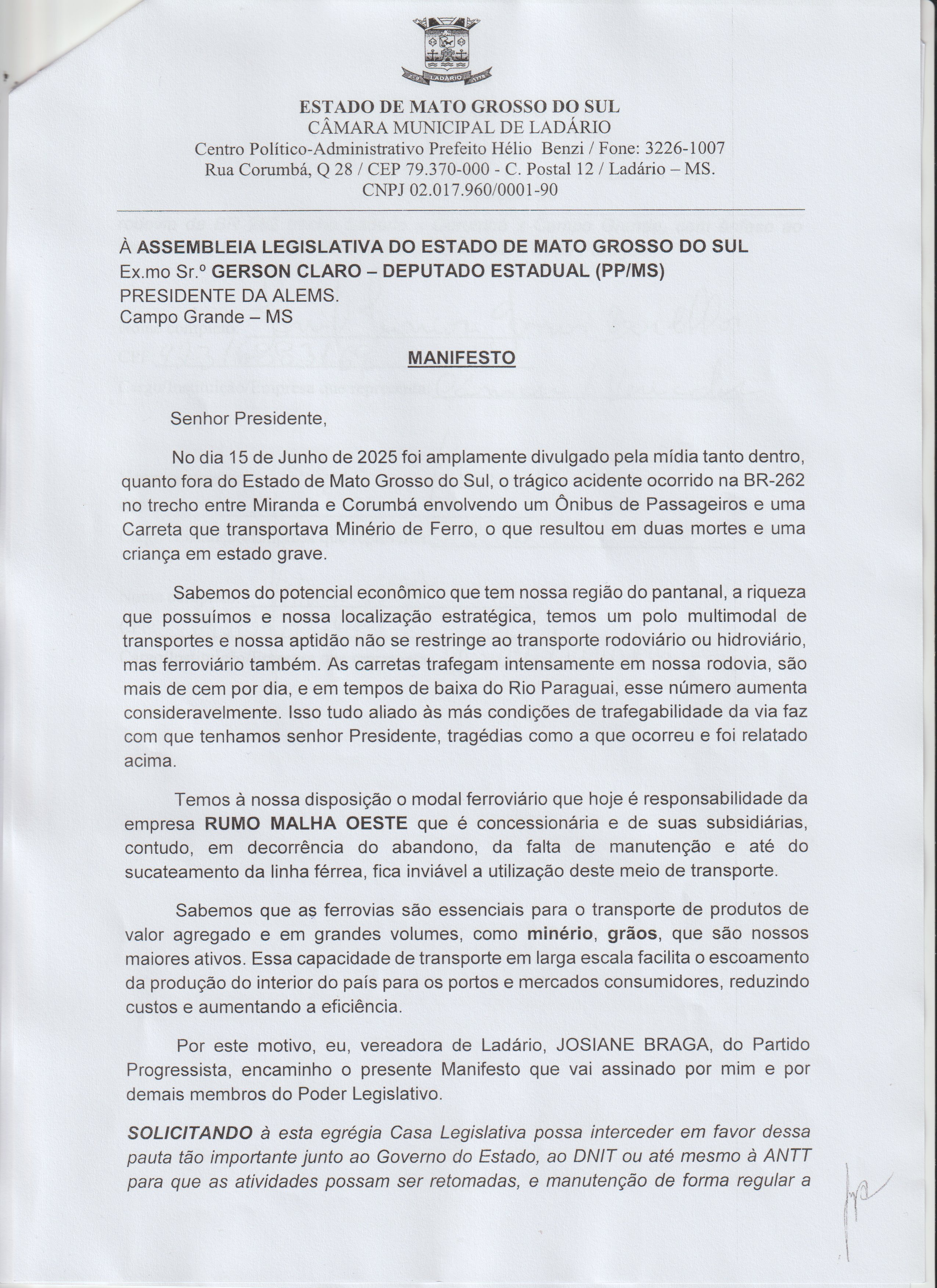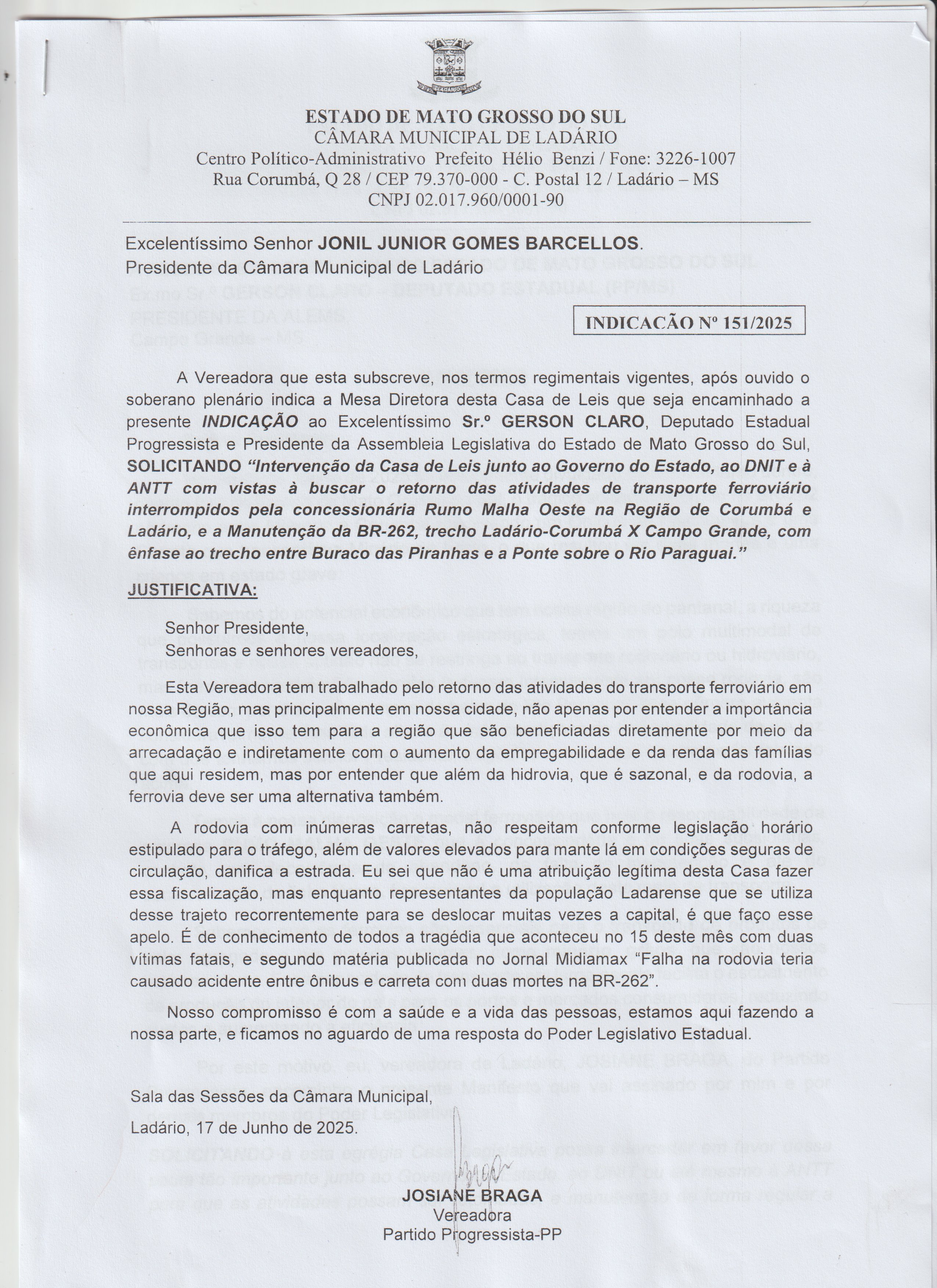 A VEREADORA JOSIANE BRAGA SOLICITA INTERVEÇÕES DA CASA DE LEIS JUNTO AO GOVERNO DO ESTADO, AO DNIT E Á ANTT CO VISTAS Á BUSCAR O RETORNO DAS ATIVIDADES DE TRANSPORTE FERROVIÁRIO INTERROMPIDOS PELA CONCESSIONÁRIA RUMO MALHA OESTE NA REGIÃO DE CORUMBÁ X CAMPO GRANDE COM ÊNFASE AO TRECHO ENTRE BURACO DAS PIRANHAS E A PONTE SOBRE O RIO PARAGUAI. |