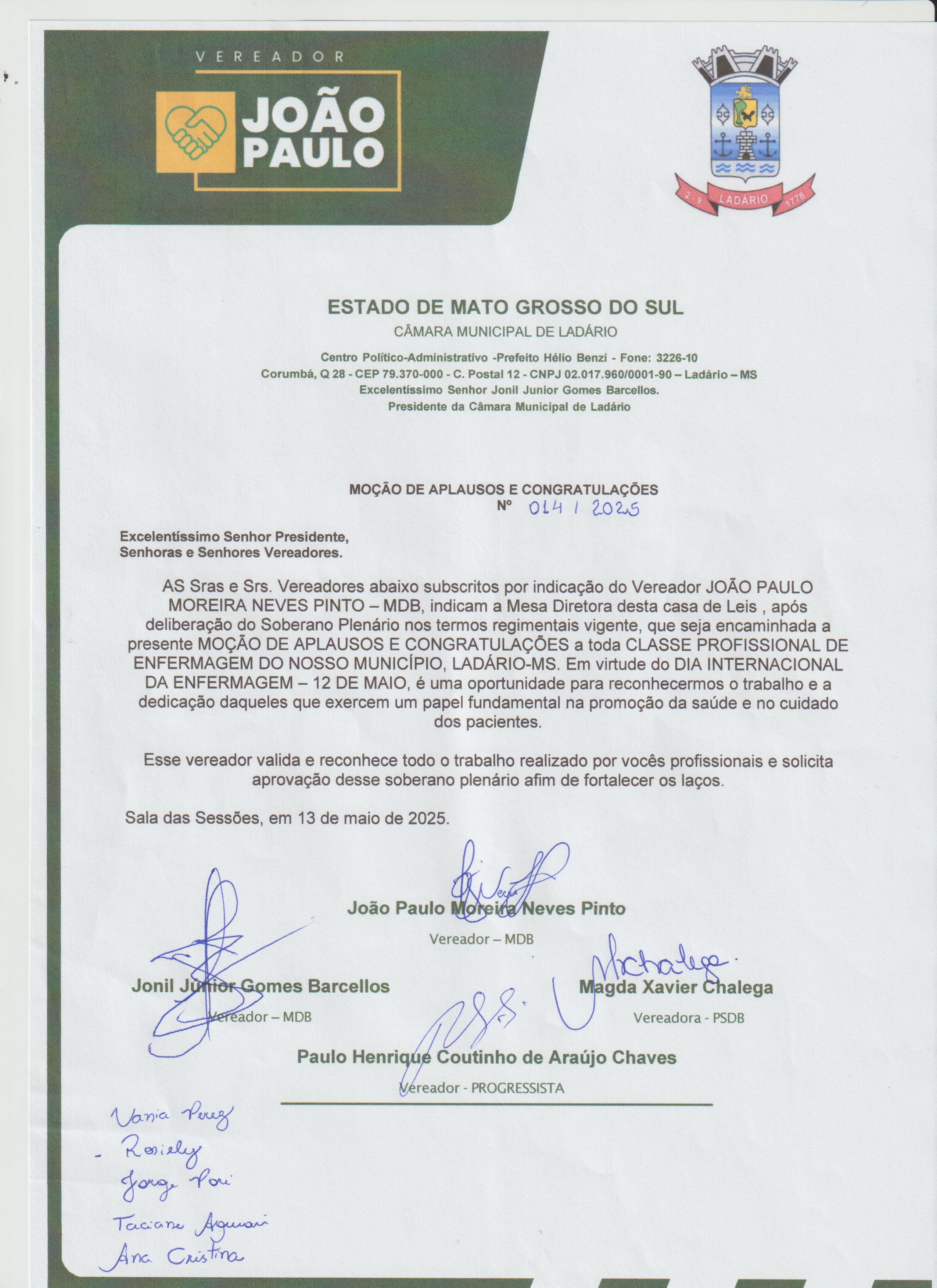 MOÇÃO DE APLAUSOS E CONGRATULAÇÕES A TODA A CLASSE PROFISSIONAL DE ENFERMAGEM DO NOSSO MUNICÍPIO LADÁRIO MS . |