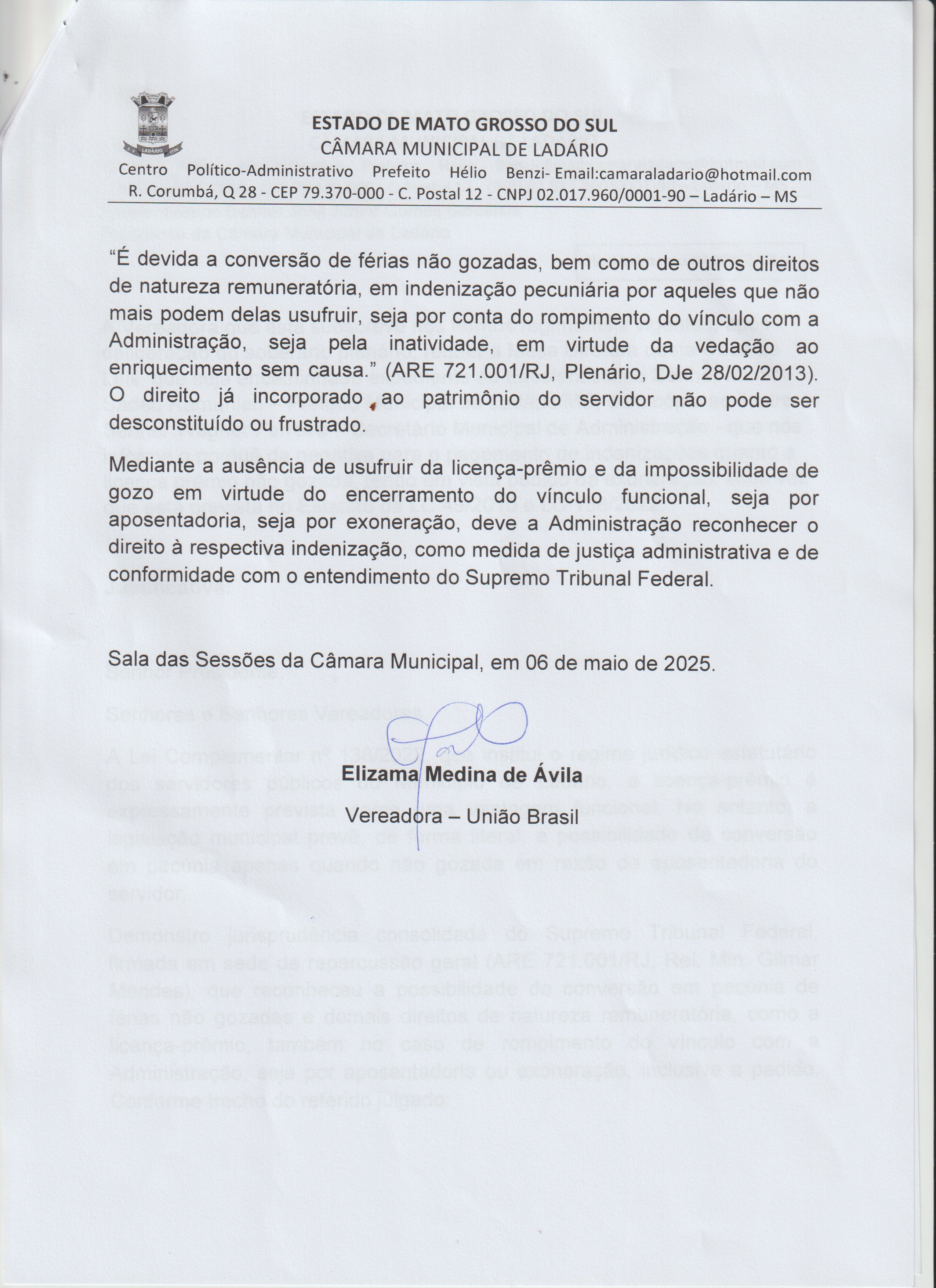 REQUERIMENTO N° 008 2025 ELIZAMA MEDINA REQUER QUE NOS INFORME O PORQUÊ DA NEGATIVA PARA O PAGAMENTO DE INDENIZAÇÕES QUANTO A LICENÇA PRÊMIO NÃO GOZADA, TENDO EM VISTA PEDIDO DE EXONERAÇÃO, UMA VEZ QUE ESTÁ PREVISTA NO ESTATUTO DA LC 49/2010 E LC 138/2022. |